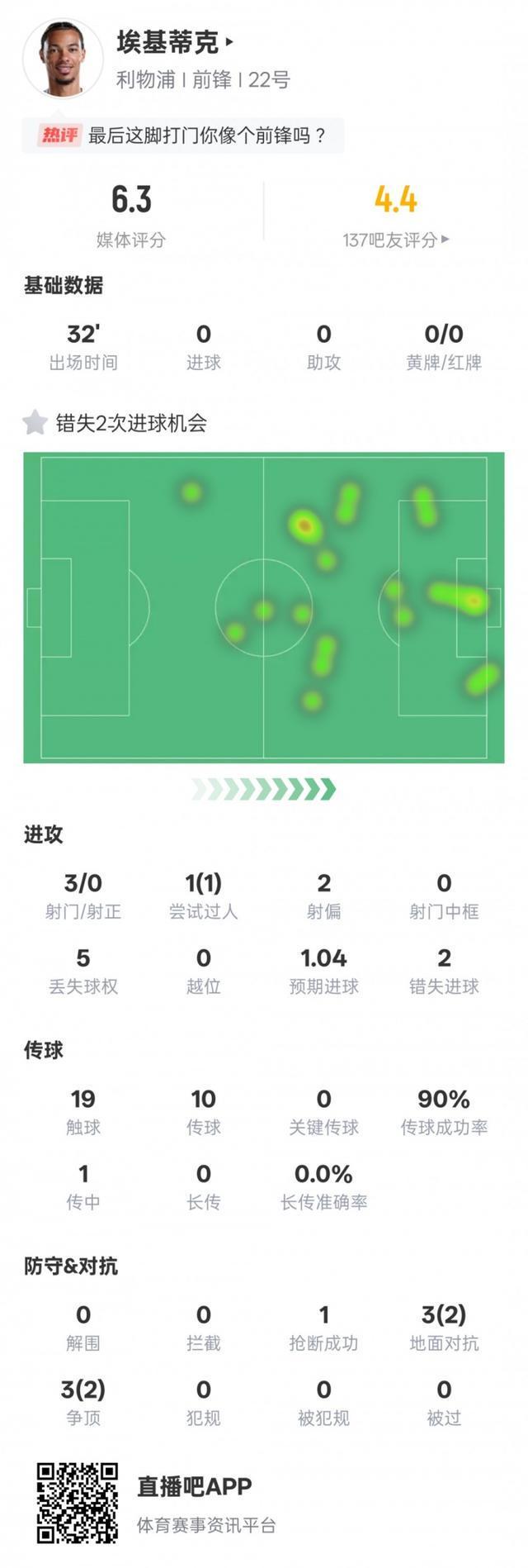 埃基蒂克本场数据:3射门0射正2次错失进球机会,评分6.3