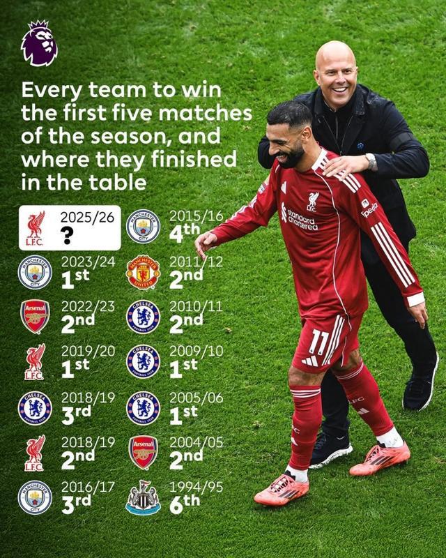 据英超官方统计,英超历史上共有14支球队赛季开局5连胜(包括本赛季利物浦),此前做到这点的13支球队之中,4支球队最终赢得当赛季英超冠军,分别是切尔西(2次)、利物浦和曼城。