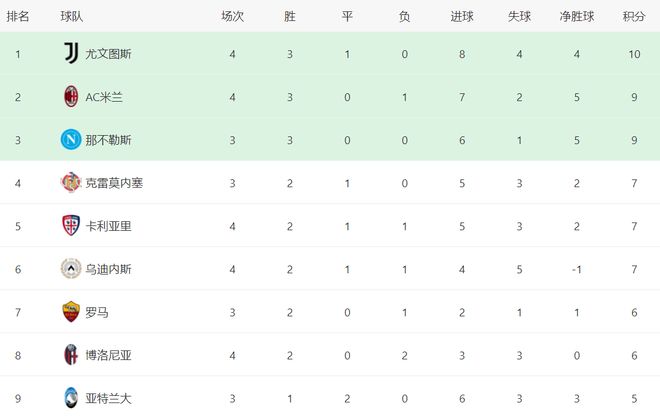 在积分榜上,尤文图斯以10分领跑,3胜1平保持不败。AC米兰则是3胜1负,拿到9分,排名第2。那不勒斯也是9分,排名第3。不过,那不勒斯只踢了3场,比前2的球队都少踢1轮。克雷莫内塞、卡利亚里和乌迪内斯都是7个积分,排名第4到第6名。罗马6分排名第7。国际米兰只拿到3分,排名第12。