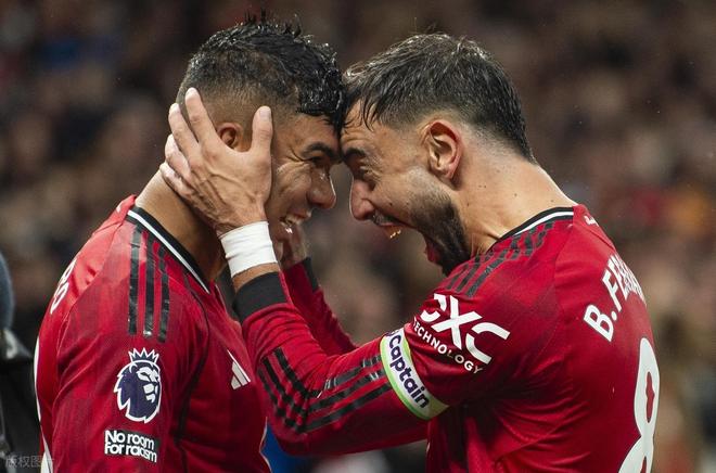 随后曼联也充分把握住了人数占优的机会展开猛烈攻势,第13分钟,曼联前场左路转移到右侧,马兹拉维跟进下底传中,多尔古后点抢点头槌往门前一顶,B费插上门线前凌空将球铲入网窝,VAR确认B费皮毛级别不越位,进球有效,曼联1:0首开纪录。第36分钟,曼联右路压上,马兹拉维禁区前沿斜吊门前,禁区内众人争抢乱成一团,马奎尔高高跃起头球顶到右侧,无人防守的卡塞米罗小禁区内超近距离强力头槌攻门,皮球应声入网,曼联2:0领先。