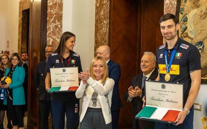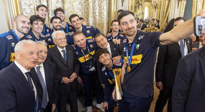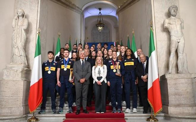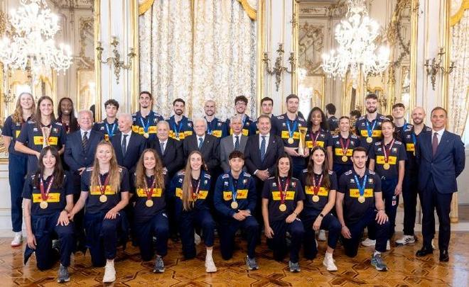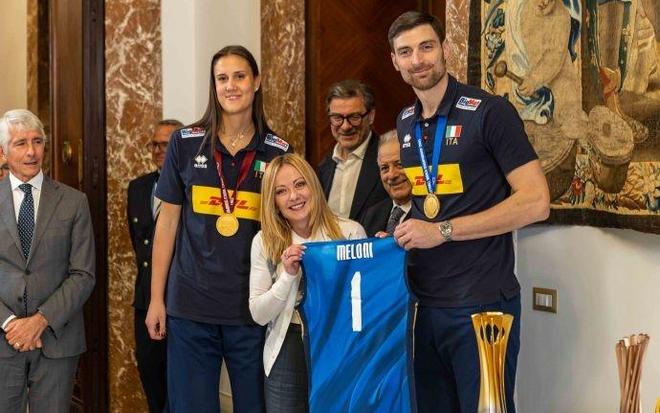 10月9日,据外媒报道,意大利国家排球队在奎里纳勒宫与塞尔吉奥-马塔雷拉总统和乔治娅-梅洛尼总理共同庆祝他们的世界冠军胜利。