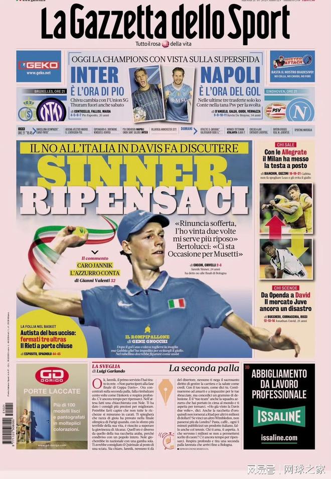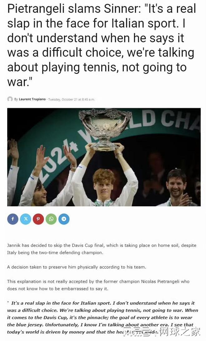 意大利网坛巨星辛纳近日陷入一场远超网球本身的风波。因决定不参加即将到来的戴维斯杯赛事,这位24岁的球星遭到了专注保护消费者权益与公民权益的非政府组织CODACONS的猛烈抨击,该组织要求撤销授予他的所有官方荣誉,包括体育外交大使任命、体育功绩金项链乃至都灵市荣誉市民称号。