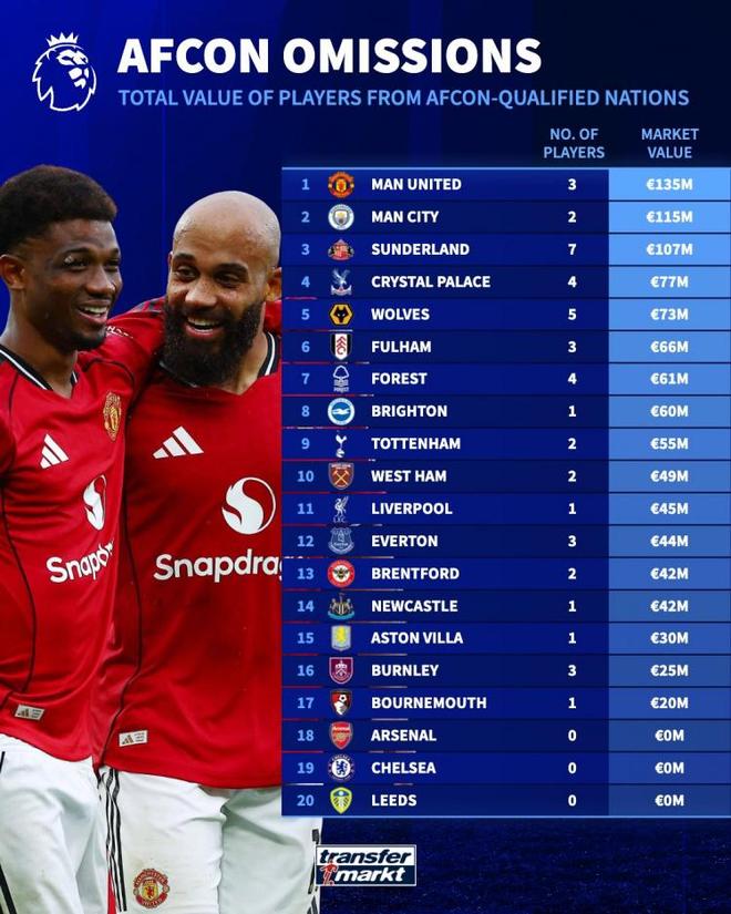 德国转会市场统计了英超各队将参加非洲杯球员的身价,并列出排名,曼联1.35亿欧居首,曼城1.15亿欧次席。