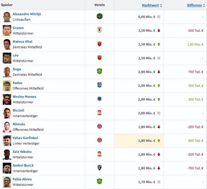 北京国安的古加从350万欧降到了280万欧,排名第五。青岛西海岸的里切利、深圳新鹏城的韦斯利、天津津门虎的哈达斯同为200万欧,并列第六。云南玉昆的布尔克、青岛西海岸的阿齐兹、成都蓉城的古尔芬克尔和罗慕洛四人同为180万欧,并列第九。