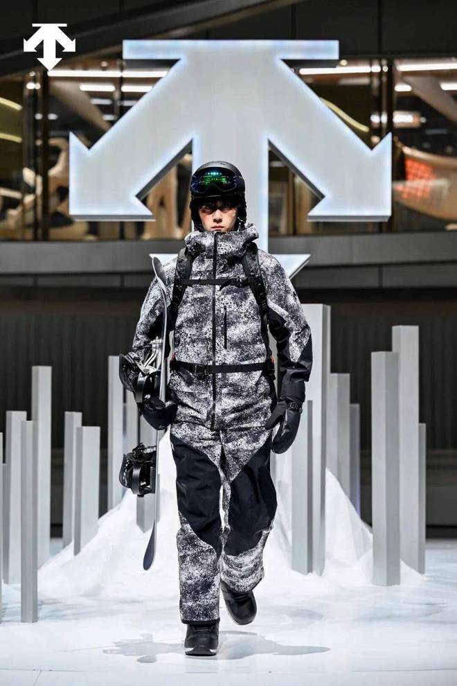 这批服装造型中,不只有品牌核心的单板、双板滑雪产品线,还有非遗香云纱面料款、ALLTERRAIN系列、与艺术家Daniel Arsham的联名系列产品等,从专业滑雪到机能风尚均有涉猎,展现了品牌适配不同时尚风格、不同场景穿搭的掌控力。