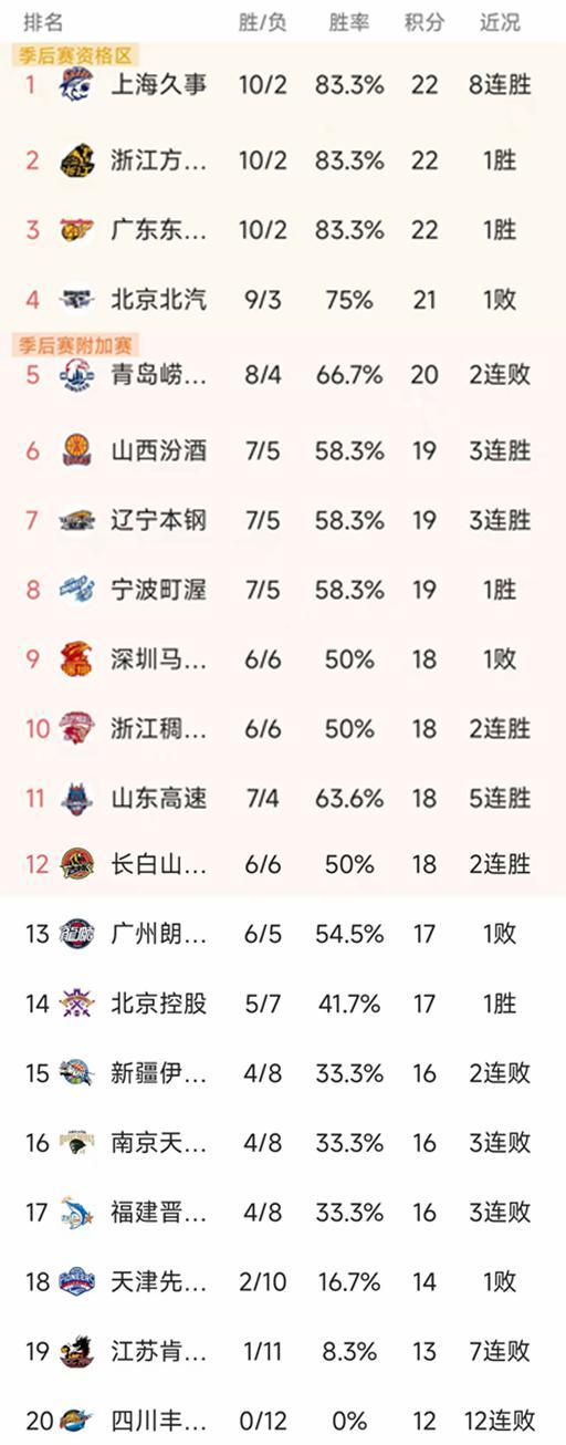 深圳、浙江稠州和吉林的战绩都是6胜6负积18分、山东的战绩是7胜4负,近期迎来一波5连胜,他们找回了上赛季的防守强度,由于少打一轮暂列第11名。广州和北控都是积17分,暂列第13和第14。新疆、南京和福建的战绩是4胜8负积16分暂列第16-第17名,天津2胜10负排第18,江苏1胜11负排第19,四川是唯一没有胜场的球队遭遇12连败。
