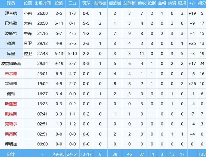勇士打出了一场完美的团队篮球,竟然多达7人得分上双,波杰姆斯基轰下全场最高的24分外加6板4助,全队三分球51中24,命中率高达约47%。