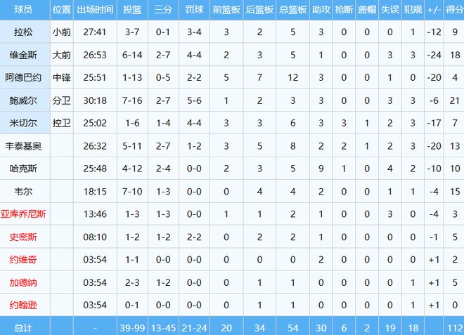 作为人类18分精华的维金斯,上半场18分,下半场0分,最终全场投篮14中6,其中三分7中2,罚球4中4拿下18分5板1助,正负值-24全场最低。
